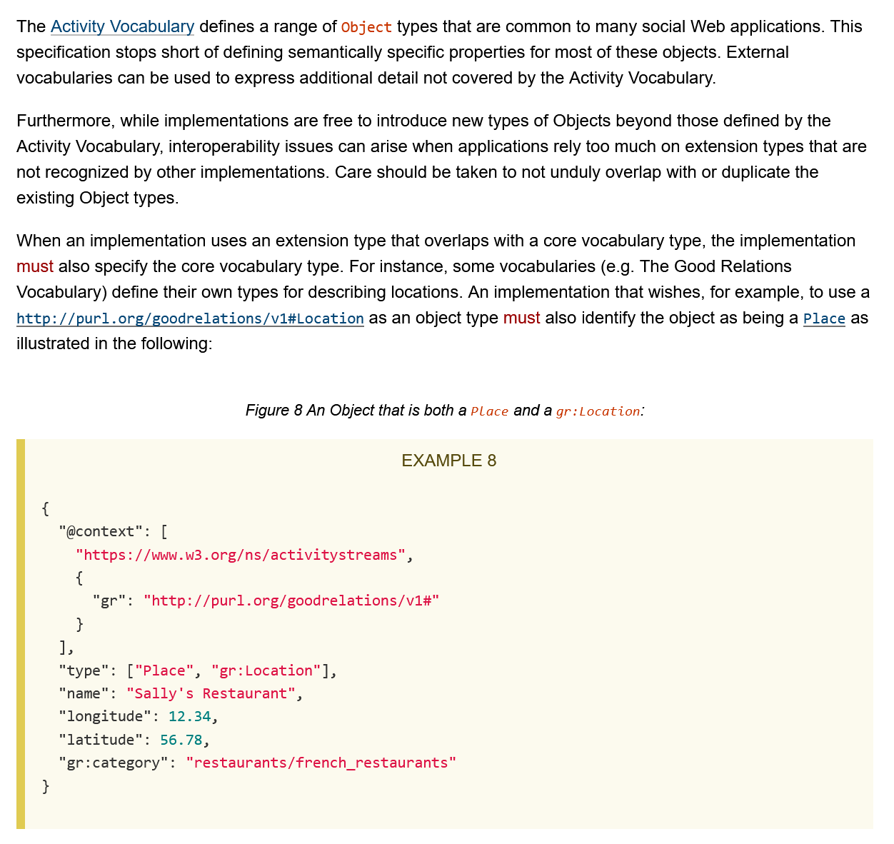 This is based on the ActivityStreams guidance around extensions: Activity Streams 2.0, especially Example 8: